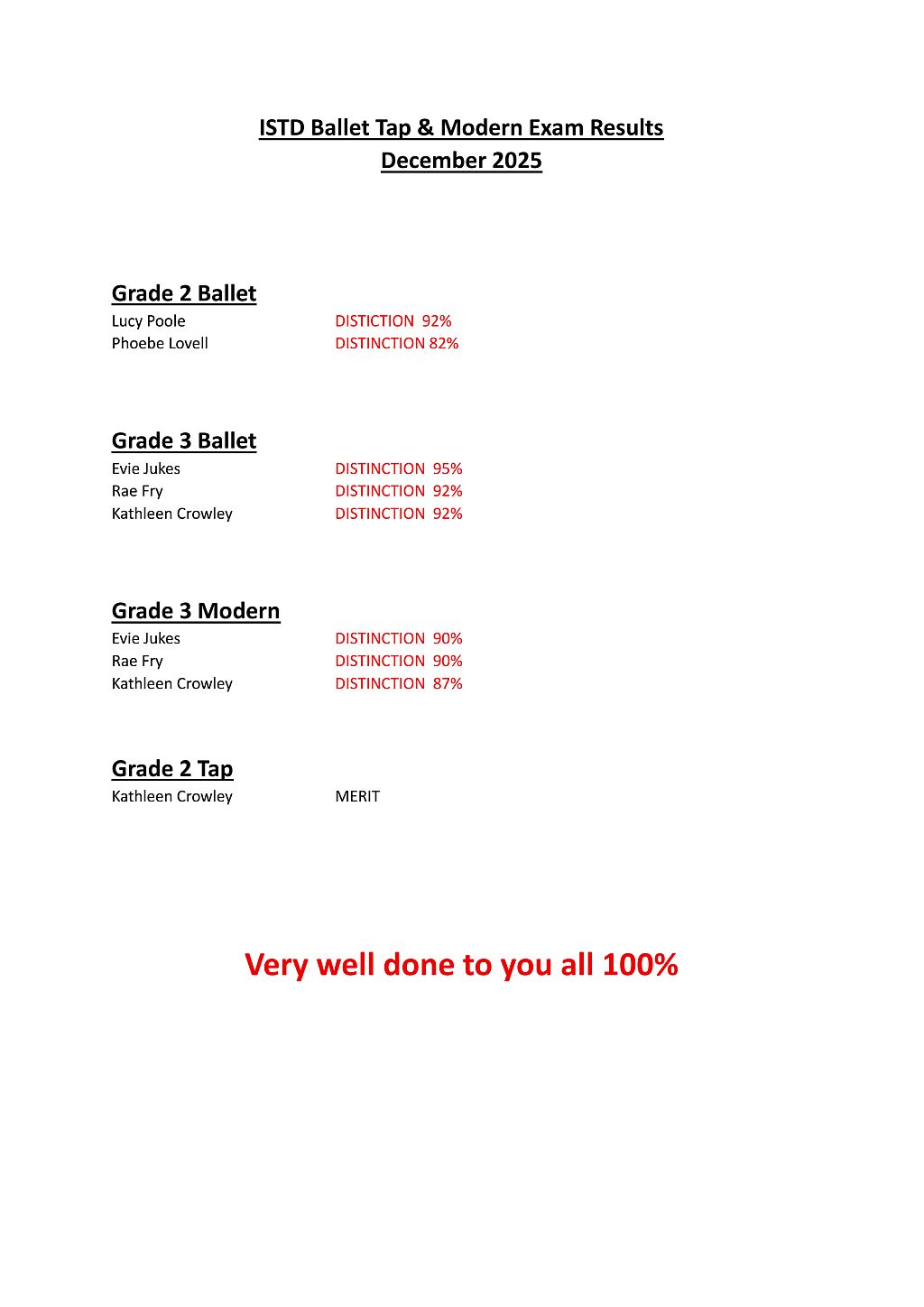 ISTD Graded and Vocational Ballet, Tap, Modern and Jazz examinations are taken throughout the year by our students at the teachers discretion.